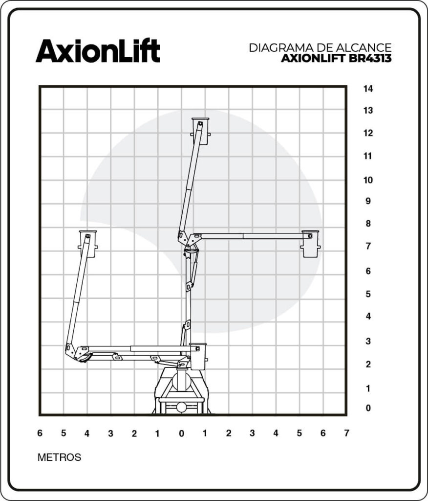 The BR4313 Elevator is an Articulated Elevator that achieves a working height of 13 m and a maximum horizontal reach of 6 m. This equipment is characterized by providing superior performance when it comes to working heights of 13 m, making available some outstanding features for a lift of this scope, such as 69 kV electrical insulation, the 150 kg auxiliary load lifter , and two individual baskets of 136 kg. In other words, the Elevator AxionLift BR4313 is superiority in 13m height.