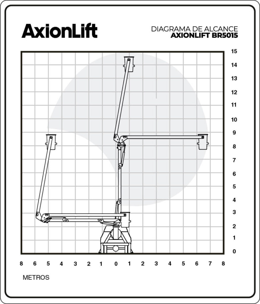 El elevador BR5015 es un Elevador Articulado que logra una altura de trabajo de 15 m y un alcance horizontal máximo de 7 m. Este equipo ofrece la posibilidad de llegar a 15 m sin necesidad de recurrir a un camión pesado o semipesado. Gracias a su bajo peso, considerando un equipo con este alcance, el elevador AxionLift BR5015 puede ser montado sobre camiones livianos, lo cual se traduce en una gran ventaja en costos. En otras palabras, el Elevador AxionLift BR5015 es superioridad en 15 m de altura.