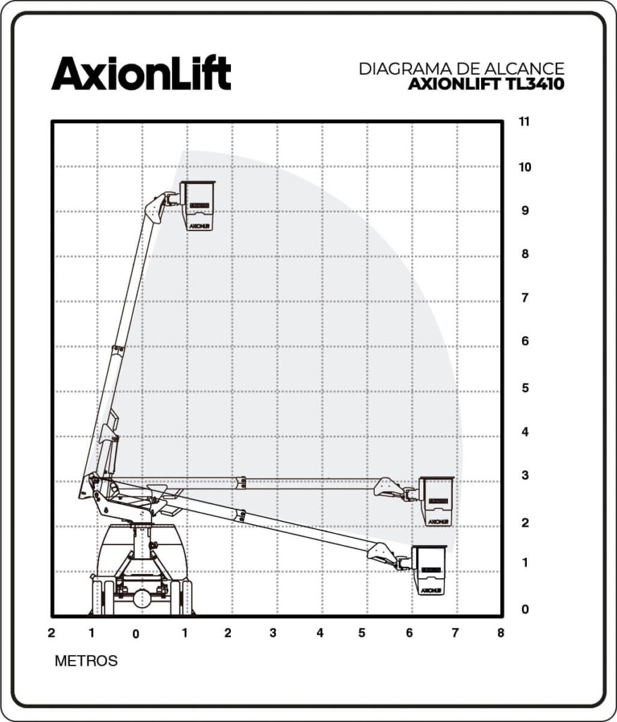 The TL 3410 is a Telescopic Aerial Lift that achieves a working height of 10,4 m and a maximum horizontal reach of 7,0 m. thanks to its telescopic boom. This Aerial Lift has a End-Mounted platform with a capacity of 182 Kg., hydraulic tilt, 180º platform rotator as well as many option that will increase your safety and productivity. Definitely, the AxionLift TL 3410 is the specialist in 7,0 m horizontal reach.