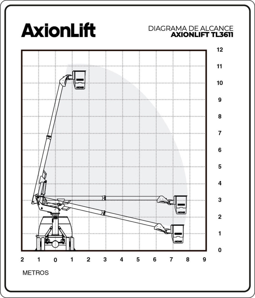 The TL3611 Lifter is a Telescopic Lifter that achieves a working height of 11 m and an outstanding maximum horizontal reach of 7.6 m thanks to its telescopic arms. These equipments come equipped with an end-mounted platform with a capacity of 180 kg, hydraulic tipping and can be equipped with a 180° platform rotor, in addition to various options that will increase your safety and productivity. Definitely, the TL3611 AxionLift Lift is the specialist in the 7.6 m horizontal reach.
