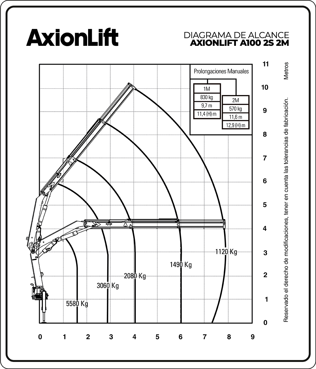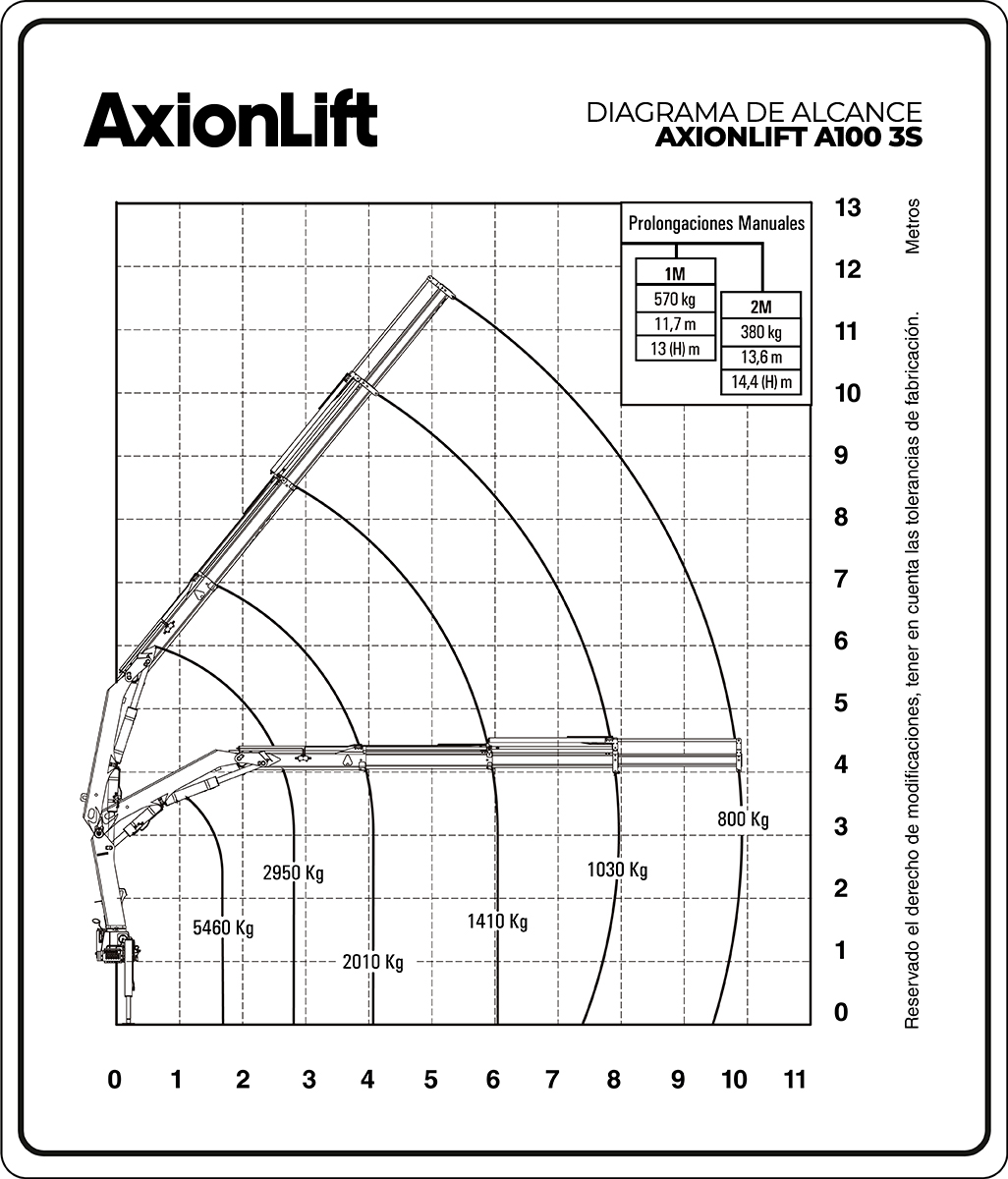 La Hidrogrúa A100 es una Grúa Hidráulica Articulada con capacidad de 9.530 kg m y un alcance horizontal de hasta 11,6 m. Este equipo puede ser dotado con tres prolongaciones hidráulicas y dos manuales, y es compatible con una amplia variedad de opcionales que la convierten en una herramienta capaz de realizar una gran variedad de tareas. Su capacidad de carga y su compatibilidad con múltiples accesorios hacen de la Hidrogrúa A100 un equipo con versatilidad total.